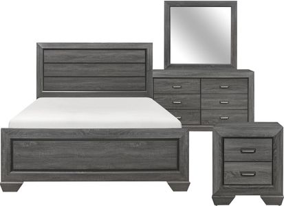 Simple yet inviting, the Ventura Gray 4-Piece Queen Bedroom Set is the perfect representation of today's popular weathered trend. A hint of weathering gives this collection a rustic vibe to its contemporary aesthetic. A large panel headboard helps anchor the space and create a theme in the coordinating pieces.Read More